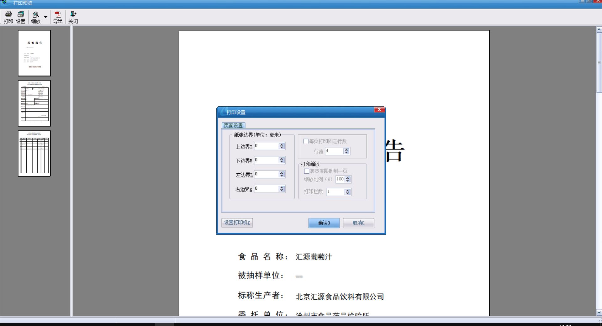 我們在預覽報告或者委托單時,發現預覽不全,這是因為我們的紙張或者頁邊距設置有錯,我們點擊一份報告進行預覽,預覽界面上有一個設置,我們打開設置進行設置頁邊距,如果還是不行,請聯系耕宇售后進行調試。
