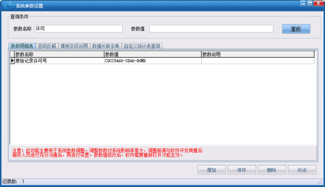 2.在系統參數設置中將耕宇售后給的許可證添加到如圖所示的參數值內,點擊確定,重啟系統后即可再增加模板。