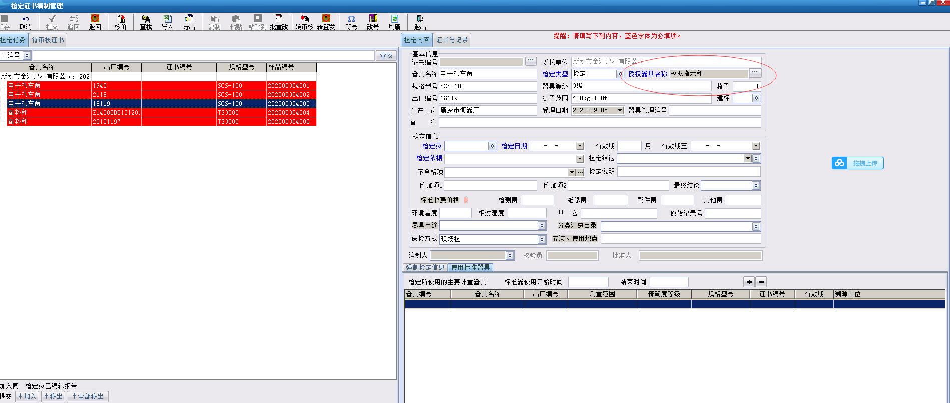 證書編制中,器具沒有選擇對應的授權檢測器具類別信息